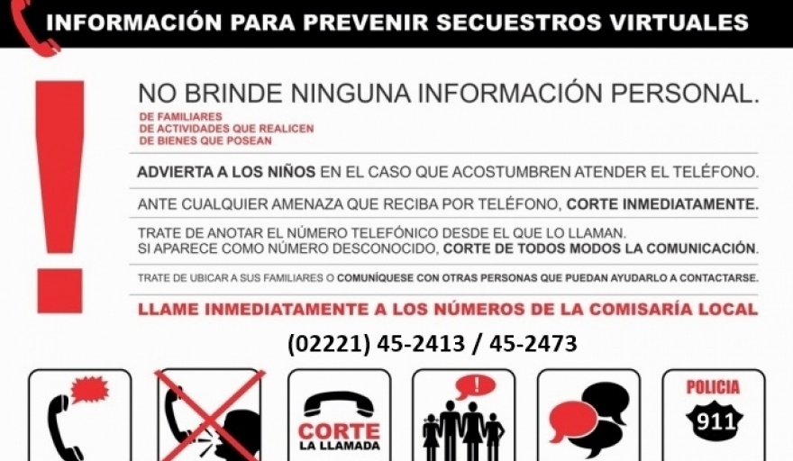 Ante la sospecha de una extorción telefónica es de suma importancia que la víctima llame inmediatamente al 911 o a la Comisaría (02221) 45-2413 / 45-2473