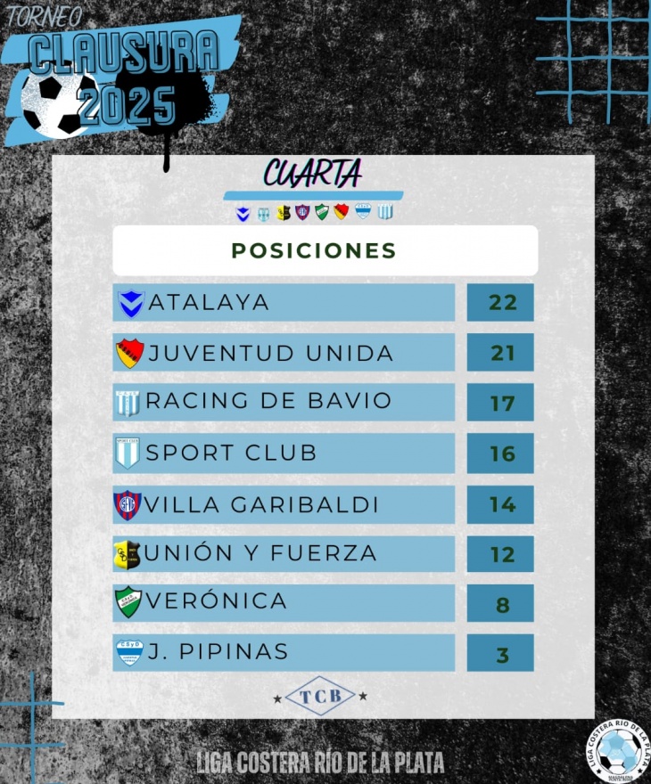 En 4ta división, Atalaya se mantiene en lo más alto con 22 puntos, seguido de cerca por Juventud Unida con 21. Racing de Bavio (17), Sport Club (16), Villa Garibaldi (14), Unión y Fuerza (12), Verónica (8) y Juventud de Pipinas (3) completan la tabla.