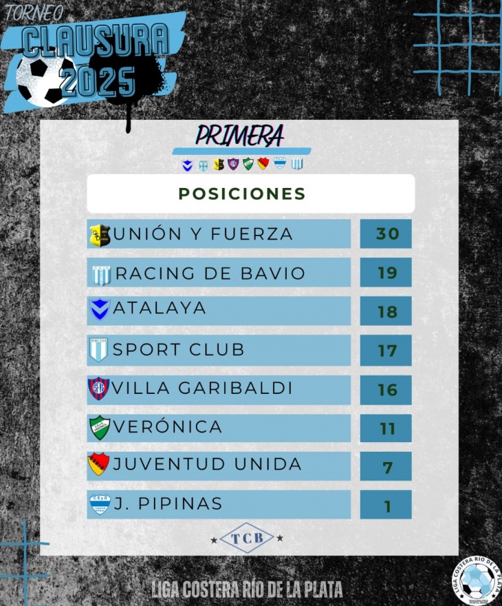 La Primera división muestra a Unión y Fuerza como único líder con 30 unidades. Racing de Bavio (19) y Atalaya (18) pelean por el segundo lugar, seguidos por Sport Club (17), Villa Garibaldi (16), Verónica (11), Juventud Unida (7) y Juventud de Pipinas (1).