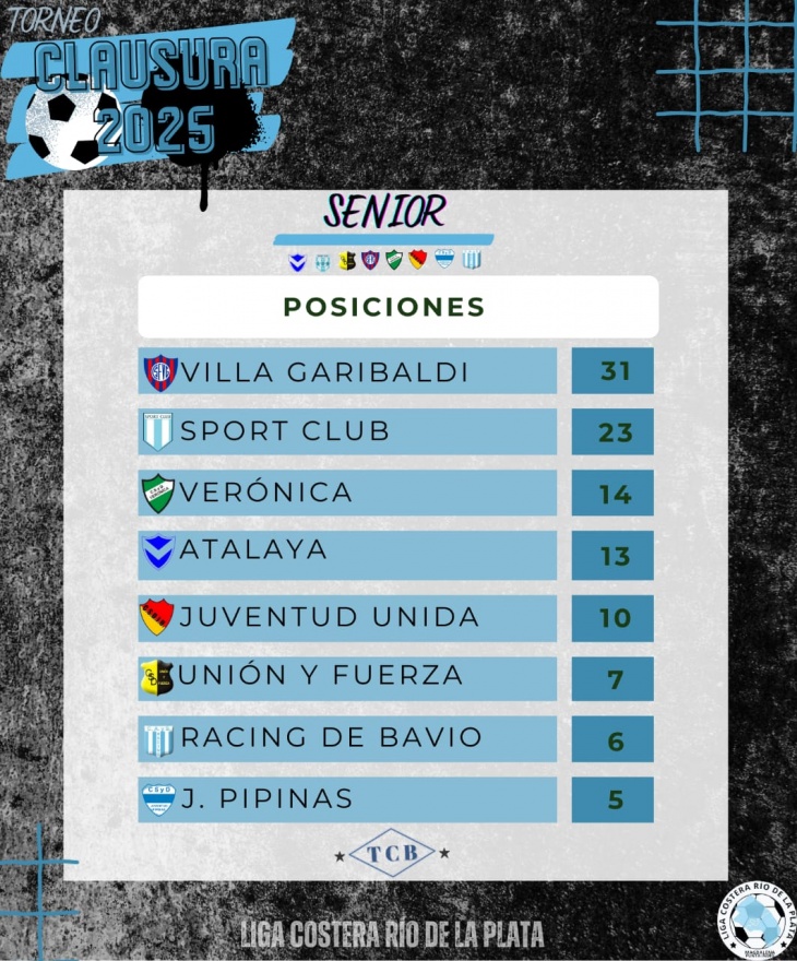 El Senior mantiene a Villa Garibaldi como líder sólido con 31 unidades, escoltado por Sport Club (23), Verónica (14), Atalaya (13), Juventud Unida (10), Unión y Fuerza (7), Racing de Bavio (6) y Juventud de Pipinas (5).