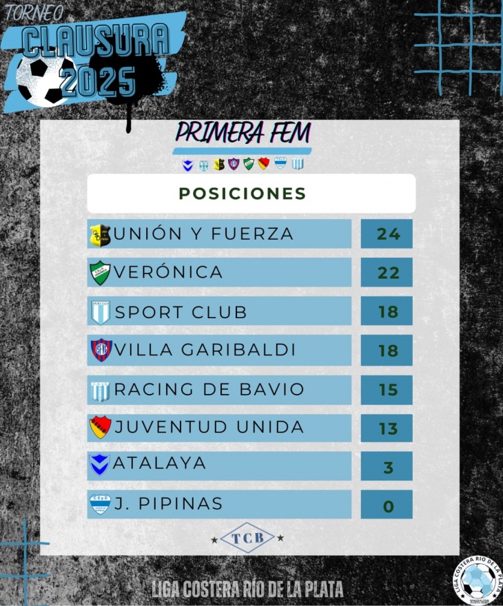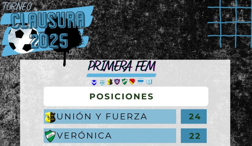 Finalmente, la Primera Femenino también mostró movimiento en la parte alta. Unión y Fuerza lidera con 24 puntos, seguido por Verónica con 22. Sport Club y Villa Garibaldi comparten la tercera posición con 18. Más atrás se ubican Racing de Bavio (15), Juventud Unida (13), Atalaya (3) y Juventud de Pipinas (0).