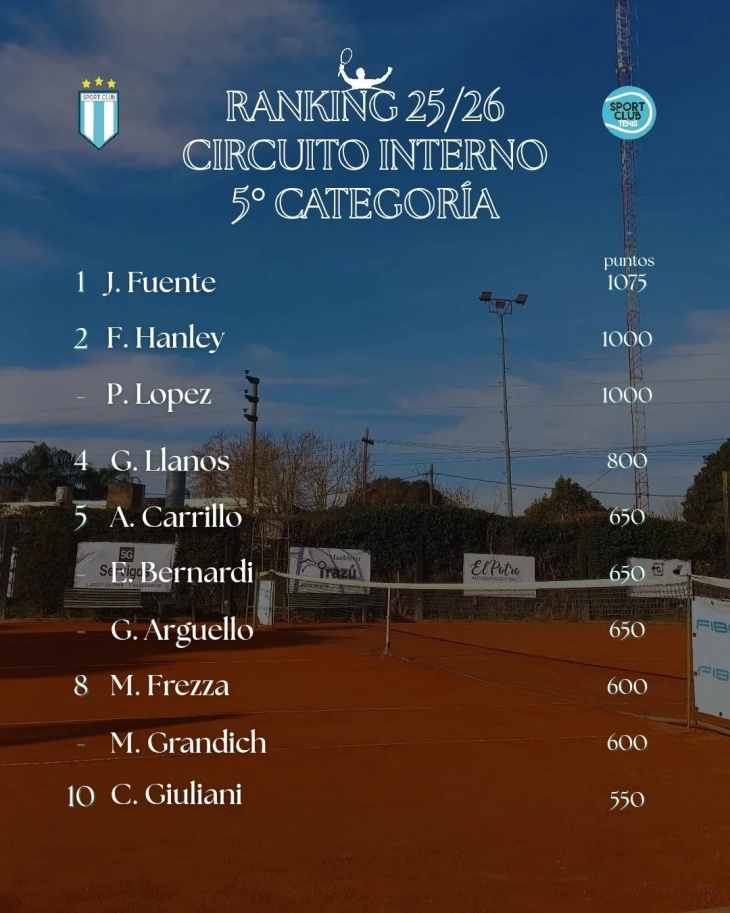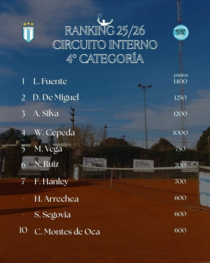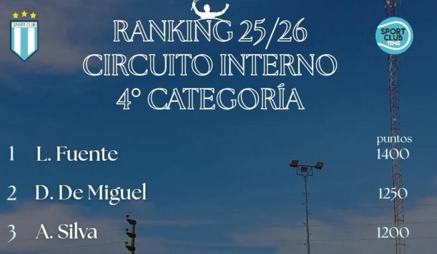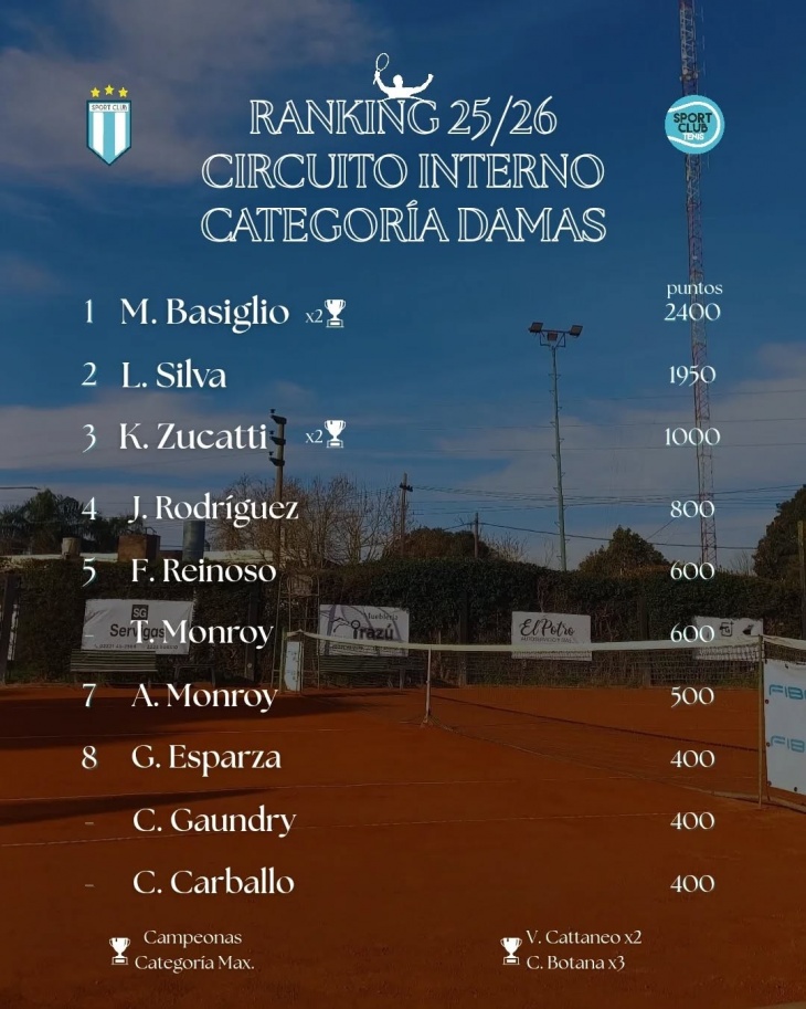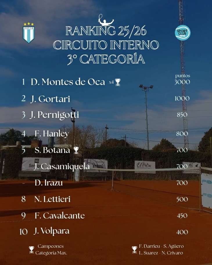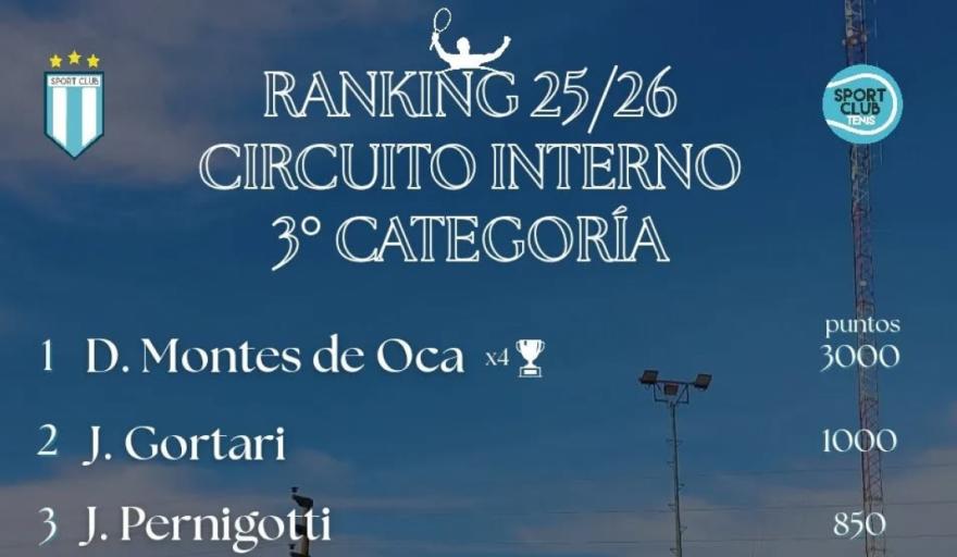 El Sport Club Magdalena dio a conocer el ranking actualizado del Circuito Interno de Tenis 2025/26, contabilizando las tres etapas disputadas durante el año 2025. De esta manera, los jugadores y jugadoras ya conocen su posición de cara a la recta final de la competencia.