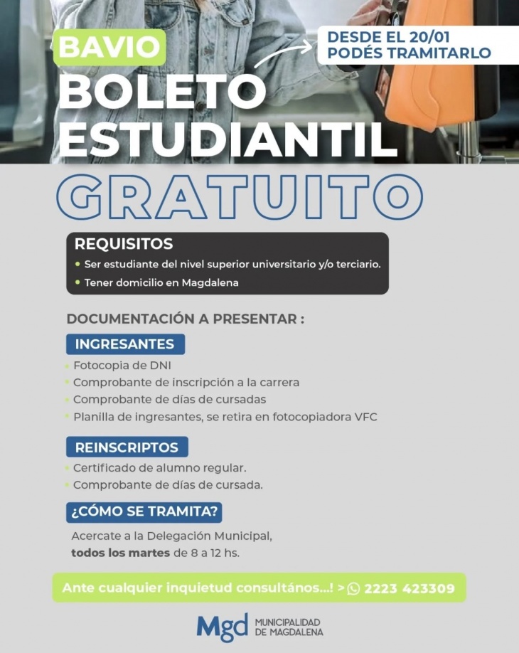La Municipalidad de Magdalena continúa impulsando políticas de acompañamiento a quienes estudian, reafirmando que la educación es una prioridad para la comunidad. En ese marco, ya se encuentra habilitado el trámite del Boleto Estudiantil en distintas localidades del distrito.
