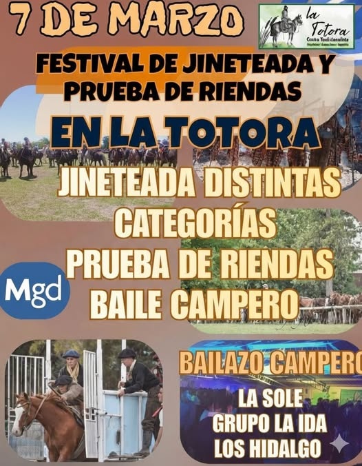 El próximo 7 de marzo el Centro Tradicionalista La Totora será escenario de un nuevo Festival de Jineteada y Prueba de Riendas en Magdalena, una propuesta que combina destreza criolla y música en vivo.