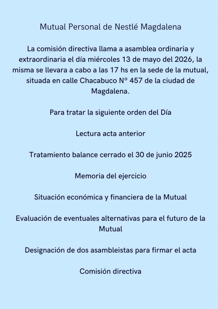 La comisión directiva de la Mutual del Personal de Nestlé Magdalena convocó a una asamblea ordinaria y extraordinaria para el miércoles 13 de mayo de 2026.